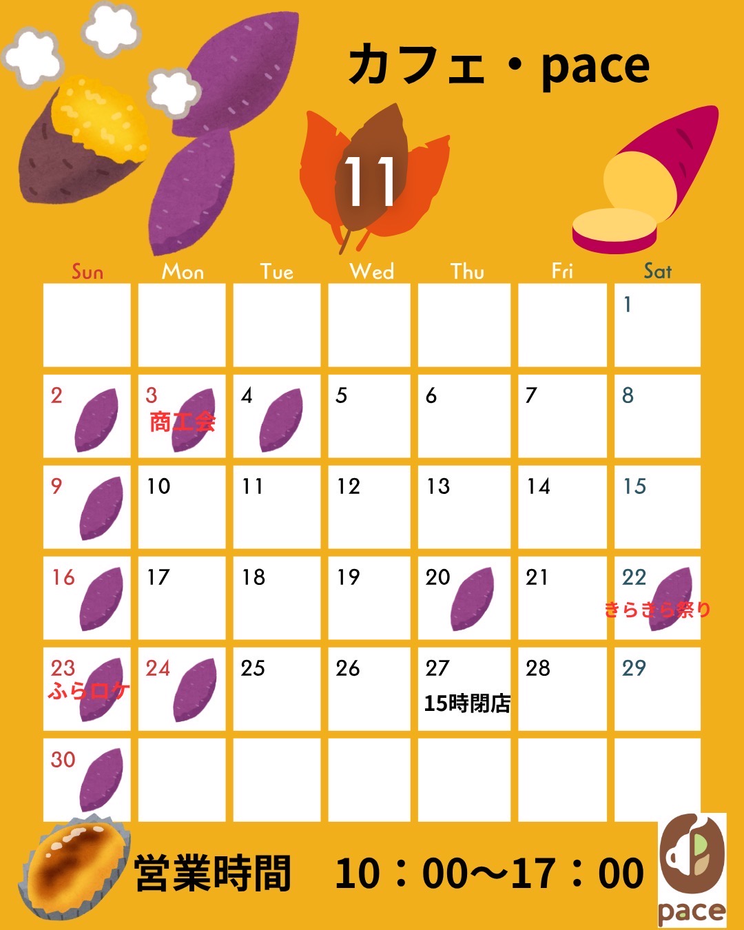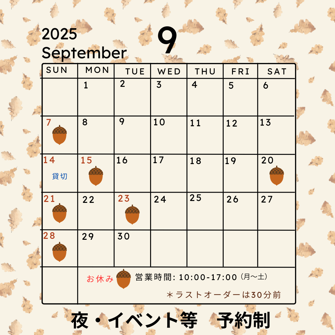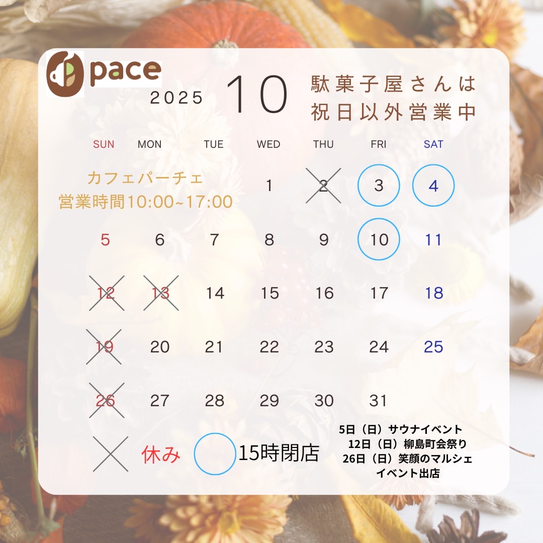 10月の予定です。急な営業時間の変更やお休み等もあるかもしれません。