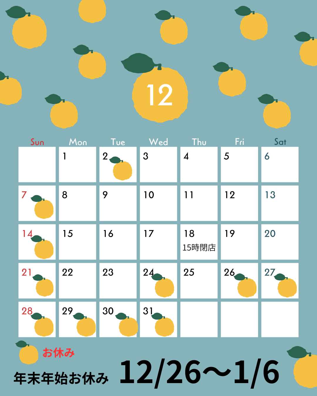 年末年始のお店のお休みは、12/26~1/6までとなっております。