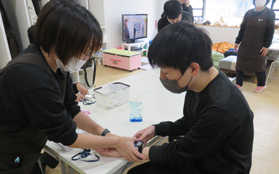 手洗いうがい・着替えが終わった方から看護師さんにバイタルチェックをしてもらいます。